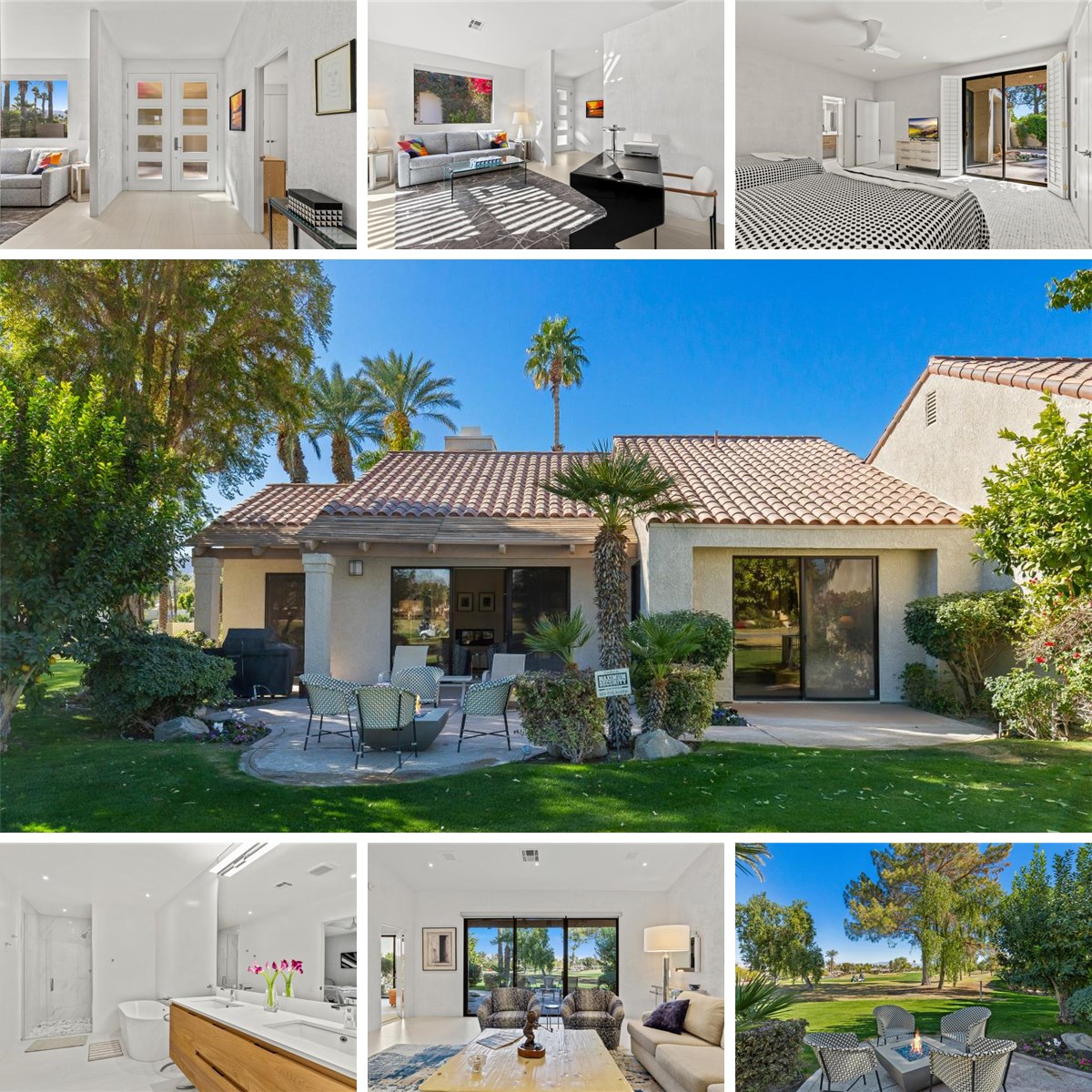 The winner is YOU - The sellers have outgrown this exquisitely renovated end-unit greenbelt residence nestled within the prestigious Mission Hills Country Club. NOW vacant and priced to sell with Immediate occupancy available for you to personalize just in time to enjoy for this season. Indulge in a lifestyle of unparalleled luxury with DUAL spacious primary suites, each featuring a private spa-like bath, PLUS a versatile den/office/media room that can easily serve as a third bedroom. Prepare to be captivated by the dramatic architecture, showcasing soaring vaulted ceilings, striking architectural raked walls, and a warm and inviting ambiance. Expansive windows frame panoramic views of the majestic mountains, lush greenbelts, and golf course, creating a truly awe-inspiring backdrop for everyday living. The open concept living area seamlessly flows from the main hallway, featuring a cozy gas fireplace and flows to the adjacent den/office/media OR Convertible THIRD Bedroom. Entertain with effortless grace in the inviting dining area, adjacent to the bright and modern fully equipped kitchen with soothing views bringing the outdoors in. Both primary bedrooms are generously proportioned, offering serene retreats with pleasing outlooks to the amazing greenbelts and mountains. Pamper yourself in the fully renovated en-suite bathrooms, designed for ultimate relaxation. Step outside to your private outdoor oasis with a rear sun patio complete with a firepit and gas BBQ area. Enjoy tranquil views of the Santa Rosa Mountains from the 14th green (par 5) of a championship Pete Dye course, while the picturesque mountain backdrop provides a stunning backdrop. Located next to a wide green belt for extra privacy and outdoor activities. Peace of mind comes standard with a long-term land lease extending for another 96 years! Moreover, the combined HOA fees and lease rate combined are exceptionally competitive compared to neighboring communities HOA fees. Convenience meets practicality with an oversized two-car garage that also accommodates a golf cart and offers ample additional storage space. Schedule your private showing today and find your dream home awaits with immediate occupancy available.